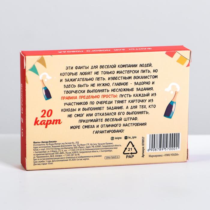 Купить игра для компании "фанты звезда бокала" 20 карт от 120 руб. с доставкой до пункта выдачи в Называевске. Интернет магазин ДекаМаркет. Оплата при получении.